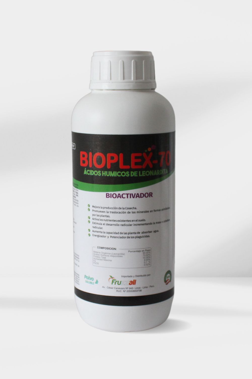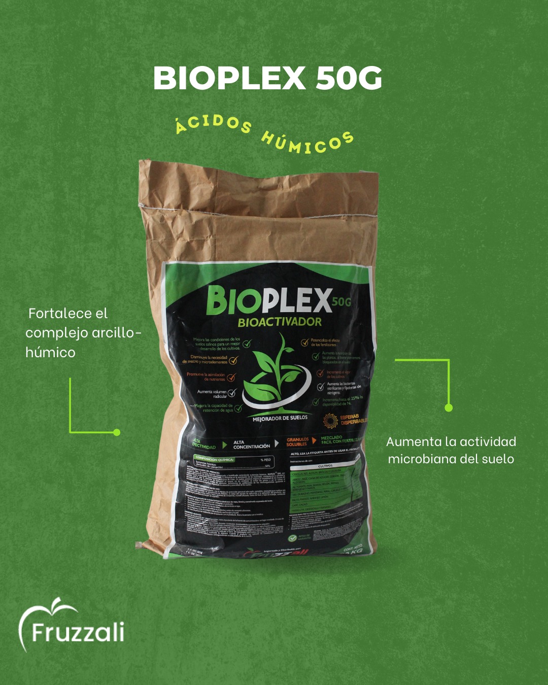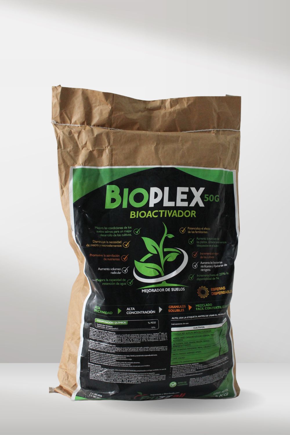 Bioplex 50G, son esferas que mejoran los suelos incrementando la eficiencia en la asimilación de los nutrientes, ÁCIDO HÚMICO que influye positivamente en la fertilidad del suelo, mejorando sus condiciones, para un mejor desarrollo de los cultivo, ademas actúa como BIOACTIVADOR, incrementando el vigor de las plantas.